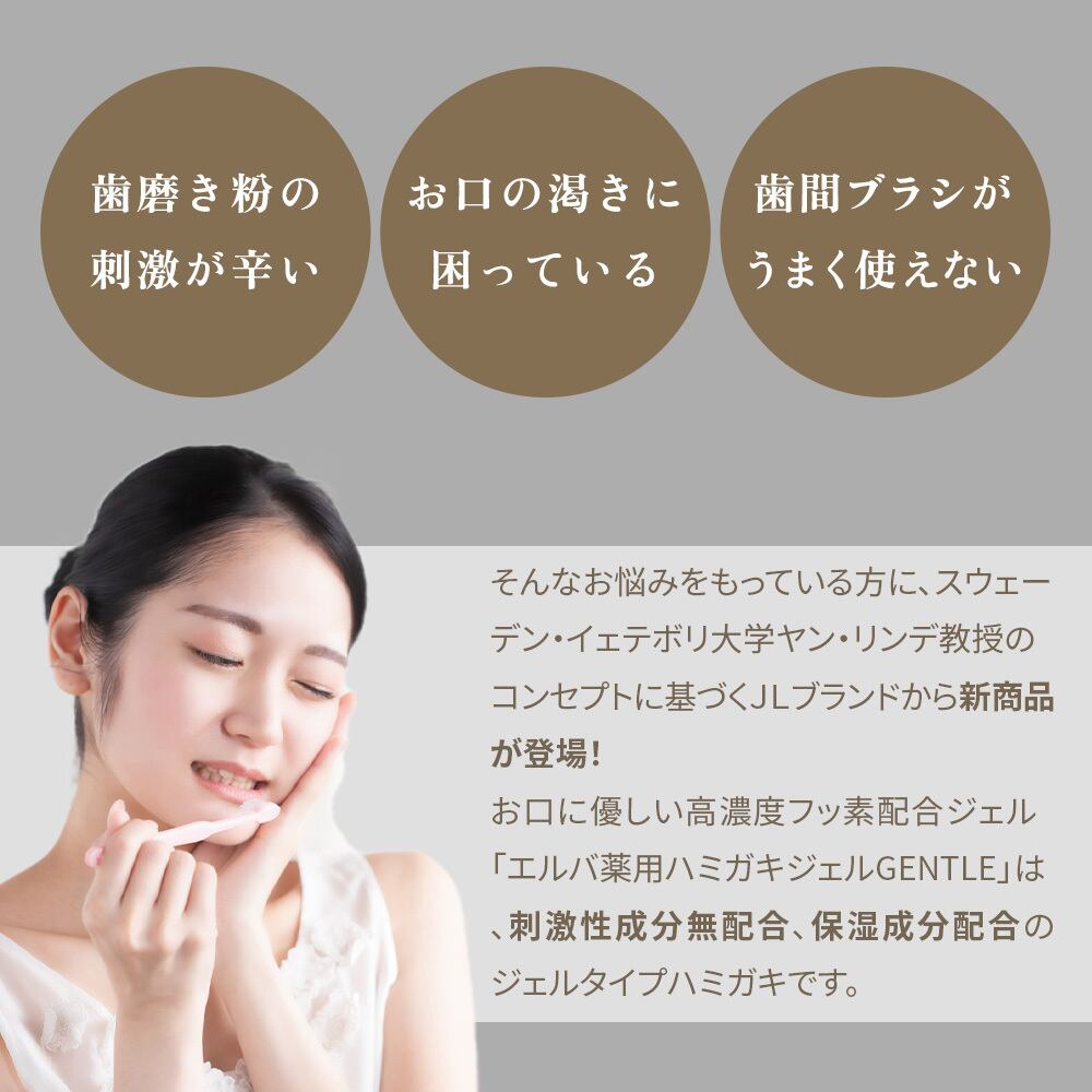 お口に優しい高濃度フッ素配合ジェル「エルバ薬用ハミガキジェルGENTLE」は、刺激性成分無配合、保湿成分配合のジェルタイプハミガキです。