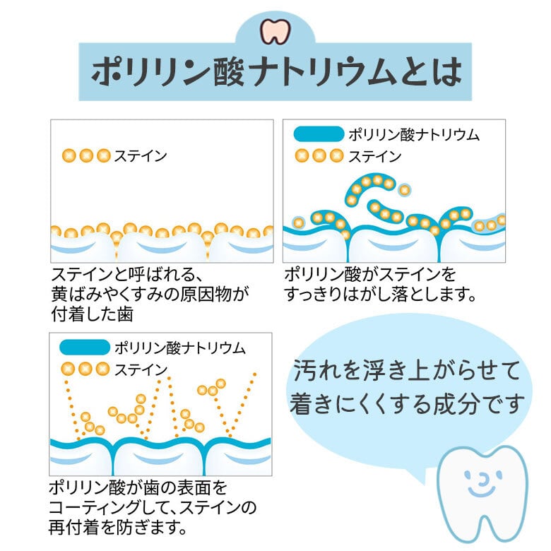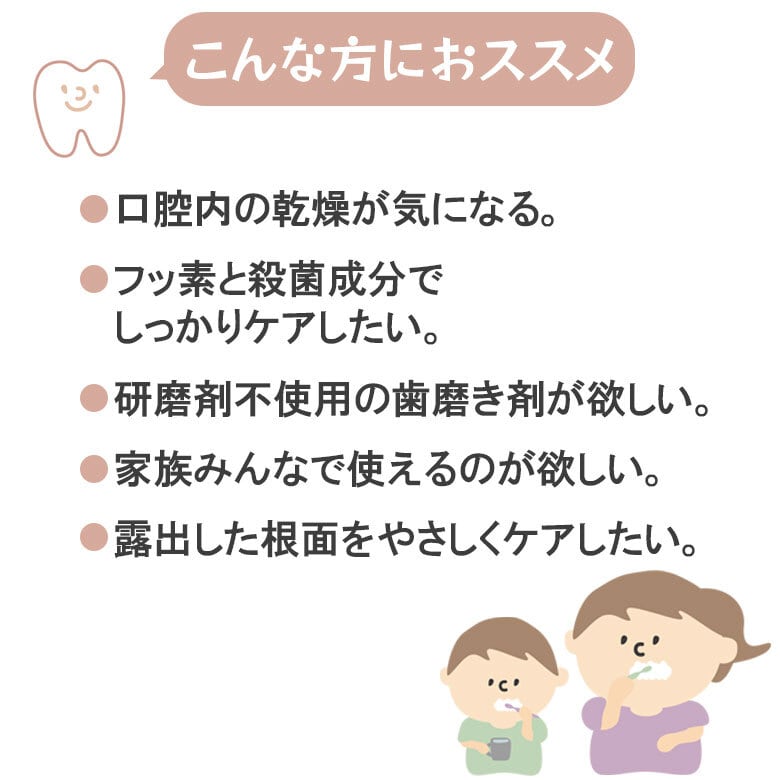 フッ素(900ppm)配合。歯質を強化し、むし歯の発生及び進行を予防。