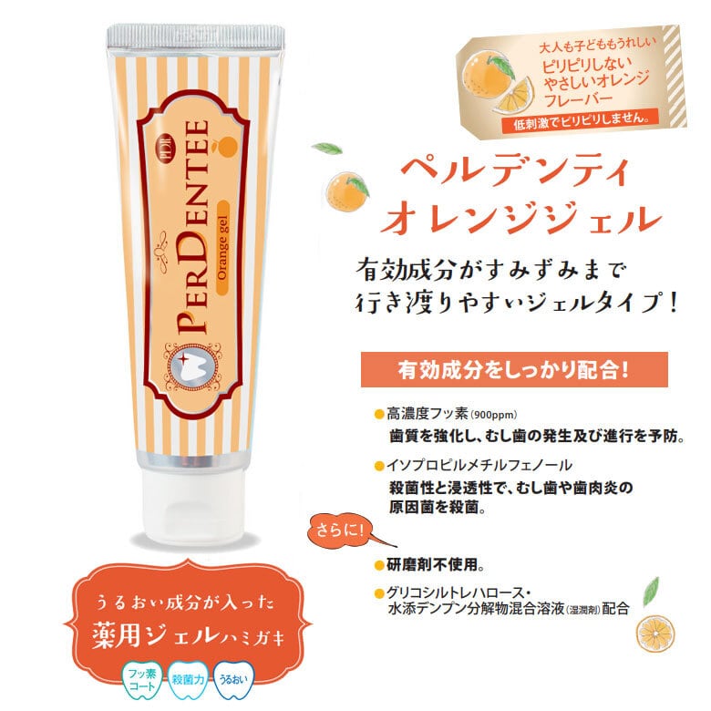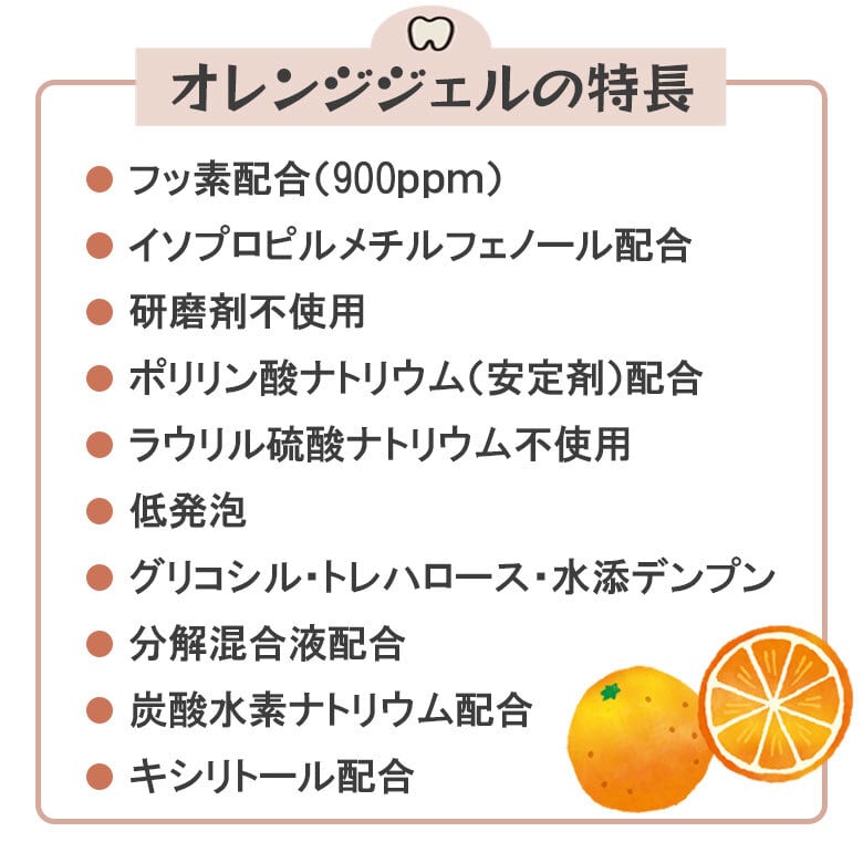 うるおい成分配合!さわやかなオレンジフレーバージェル。研磨剤が入っていないハミガキです!