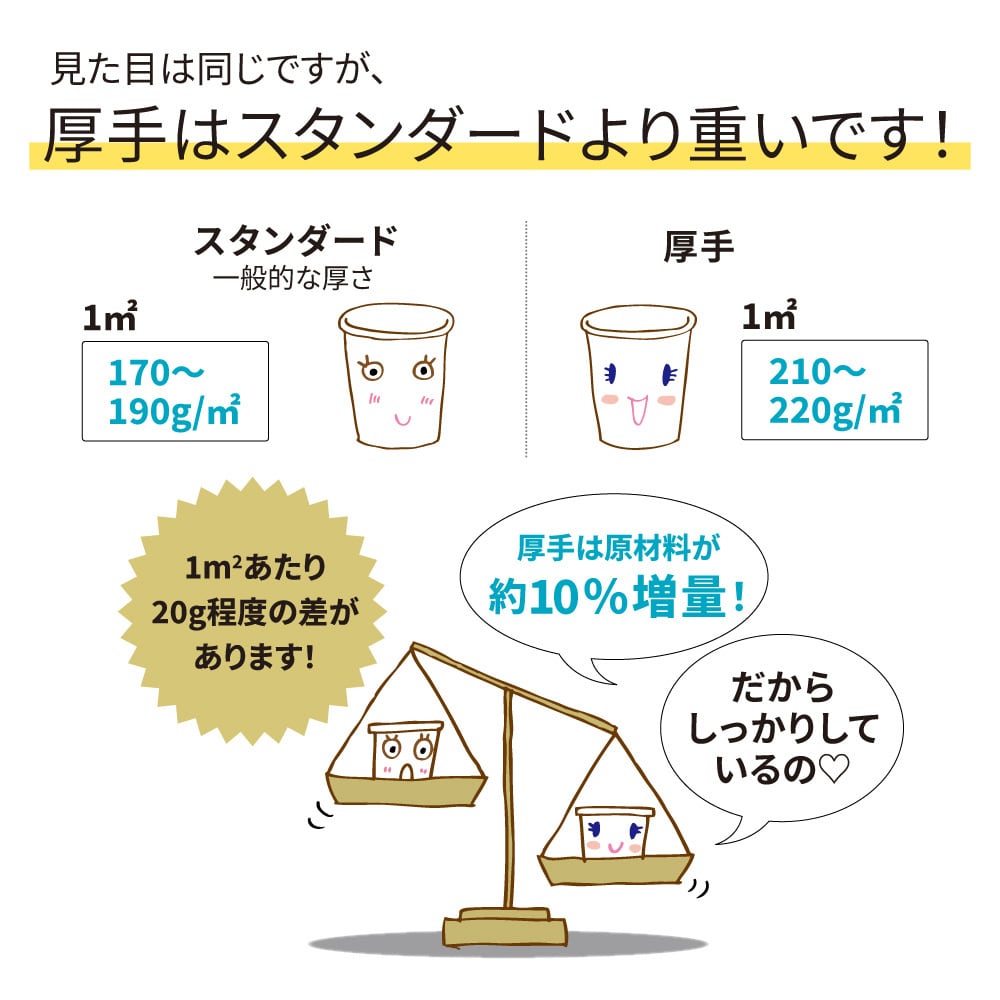 厚手はスタンダードタイプよりも原材料を10%増量しているので、重みがあってしっかりした紙コップです。