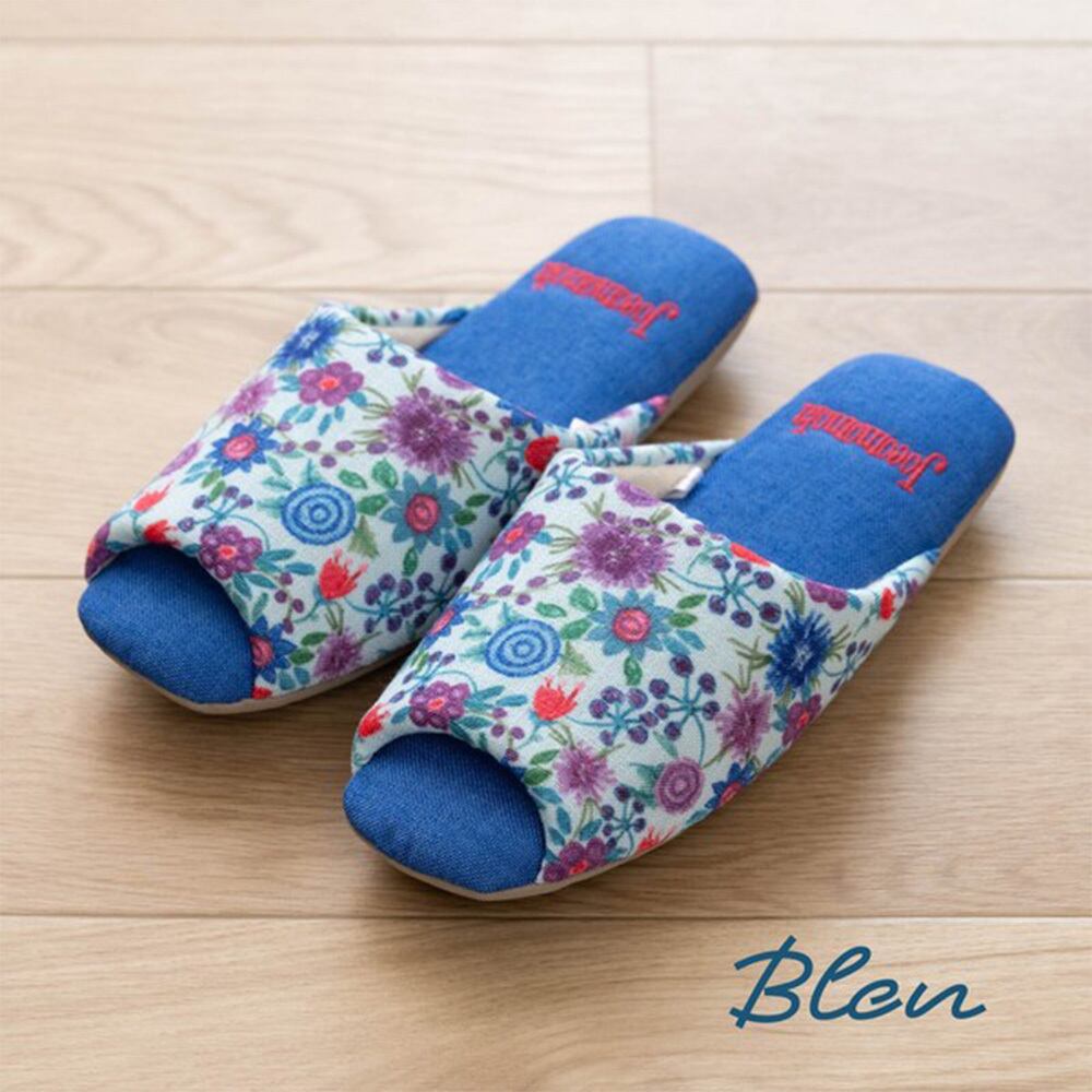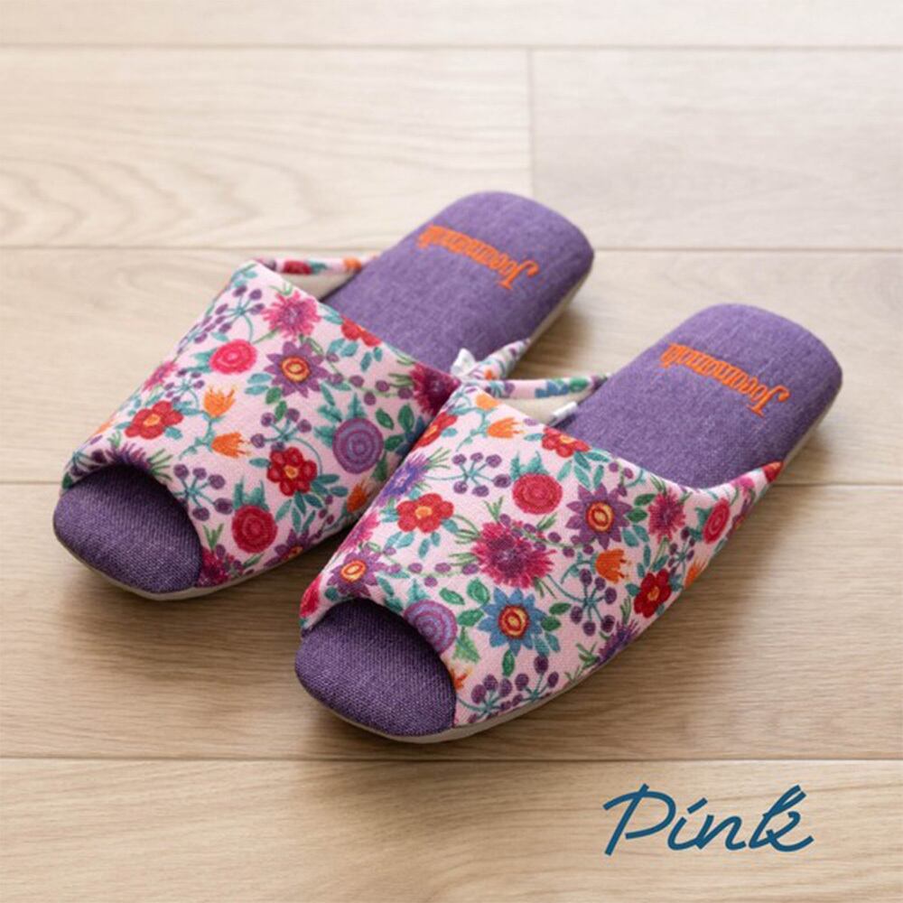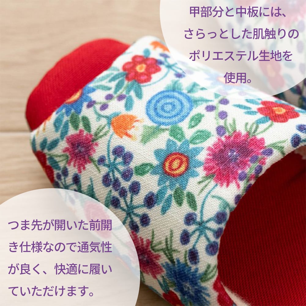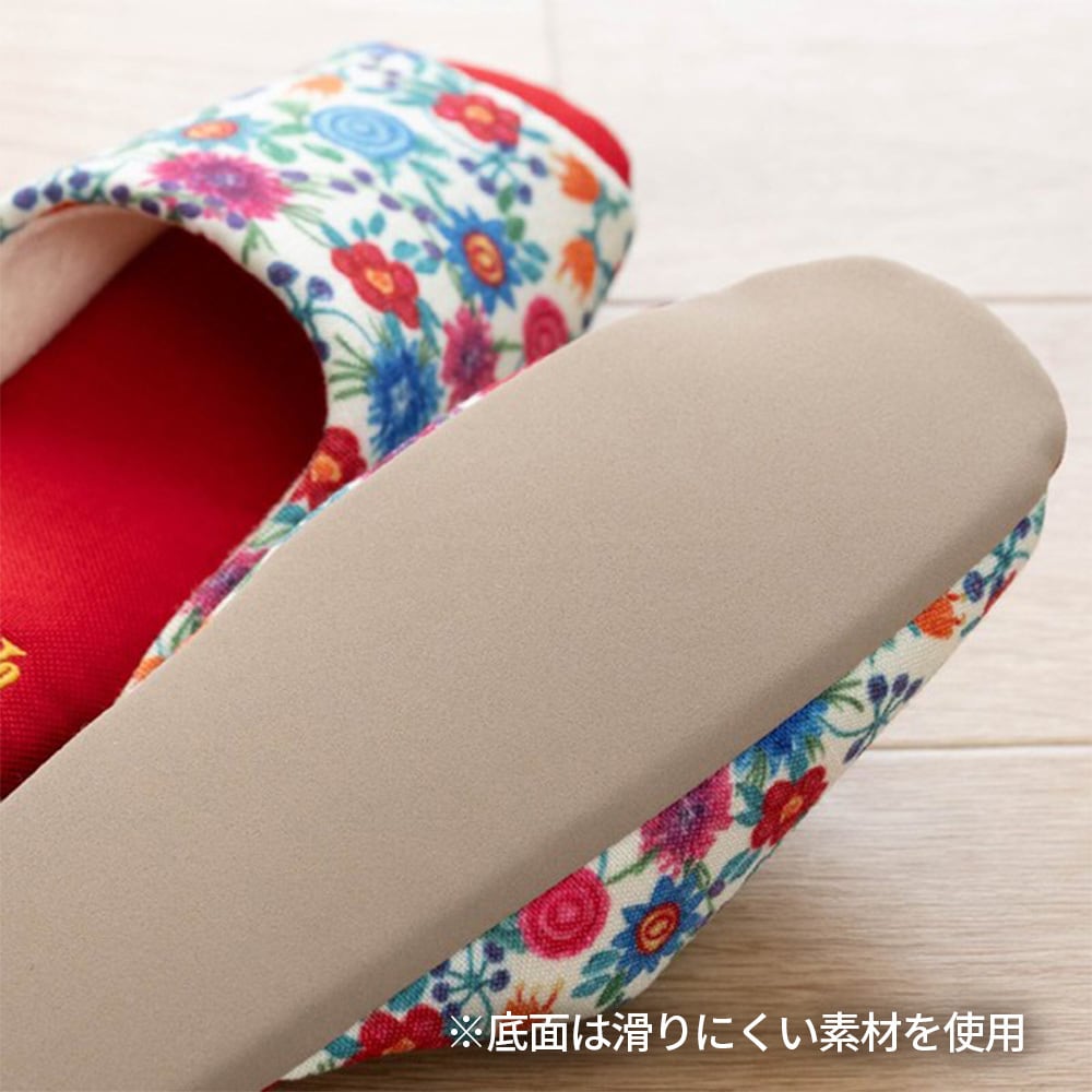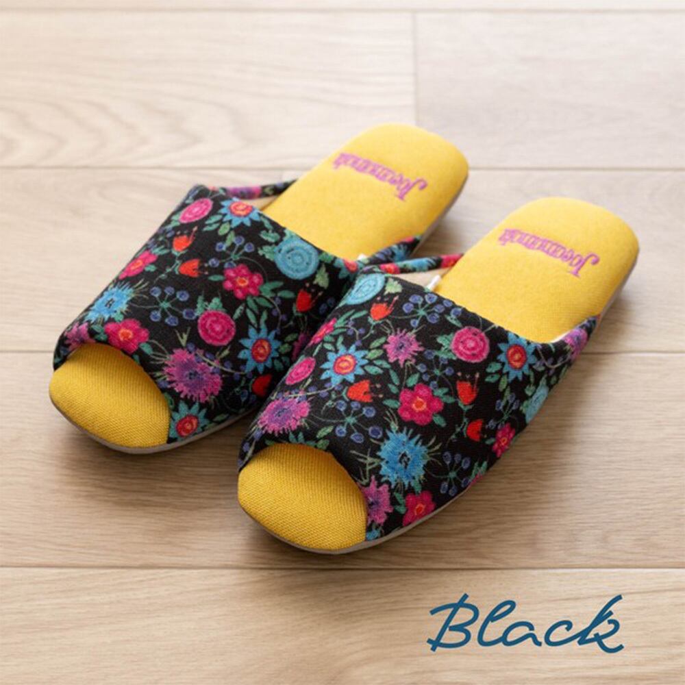 ホコモモラらしいカラフルでポップな花柄が目を惹く、前開きタイプのスリッパ。