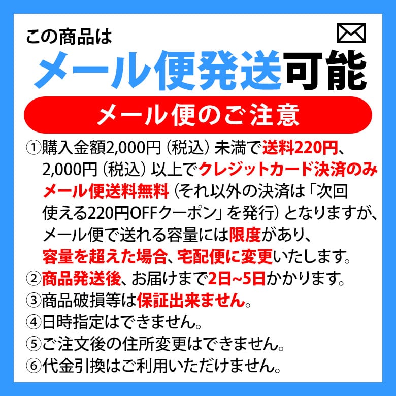 商品のお買い上げ金額が「税込2,000円以上」かつ「クレジットカード払い」でメール便送料無料となるように価格を修正します。「税込2,000円以上」お買い上げの場合も「クレジットカード払い以外の支払い方法」の場合は価格修正できないため「次回使える220円クーポン」を発行させていただきます。但しメール便容量オーバーの場合は、上記ゆうパケットに関する内容は適用されず、佐川飛脚宅配便550円へ変更します。