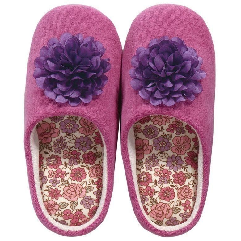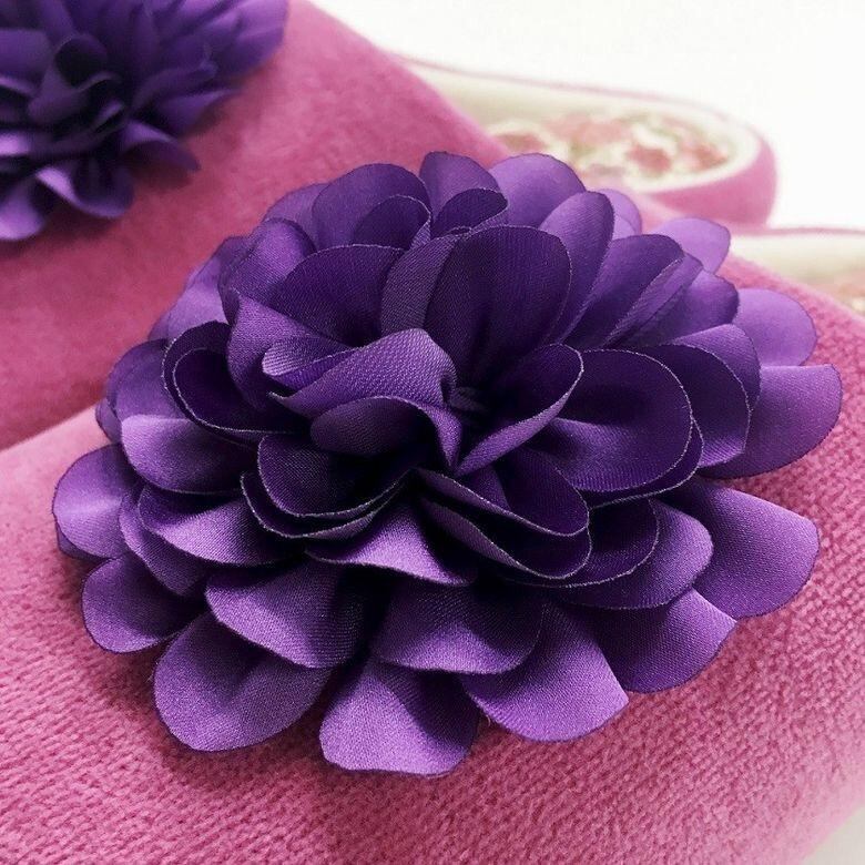 サテン生地の花モチーフを付けたインテリアスリッパ。 中板には小花柄がプリントされた生地を使用、 表生地にはふんわりと柔らかな綿ベロアのカラー生地を使い にぎやかで楽しいデザインになっています。 ウォッシャブル(タンブラー乾燥不可)